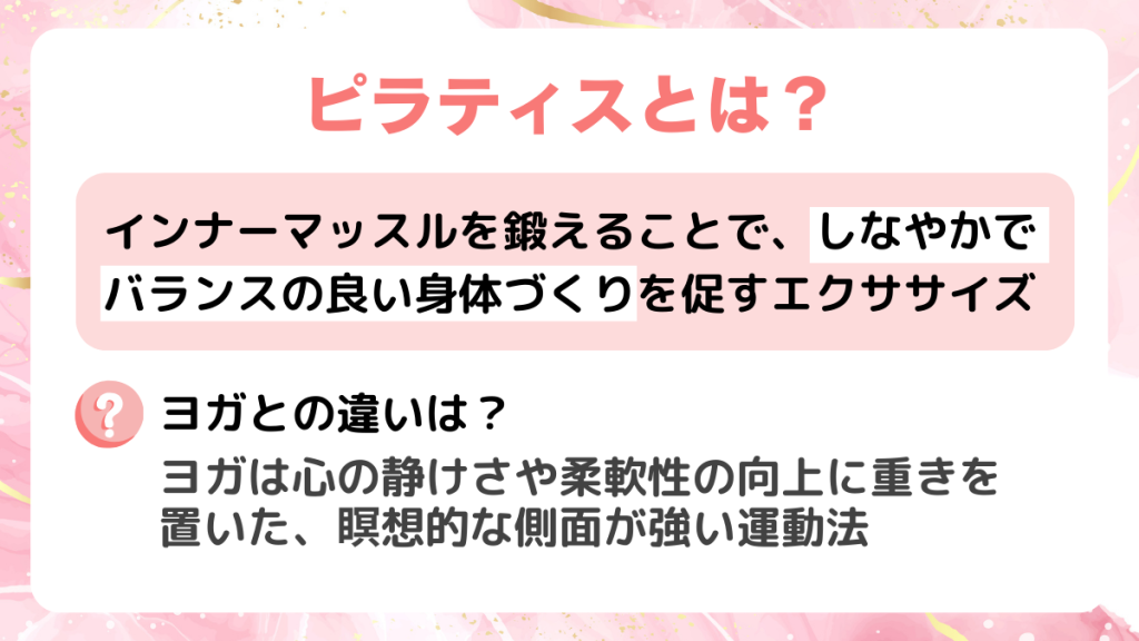 ピラティスとヨガは一見似たエクササイズとして紹介されることが多いですが、目的やアプローチには明確な違いがあります。