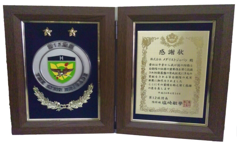 東日本大震災における支援活動に対し、自衛隊松本駐屯地より授与された感謝状と記念盾。