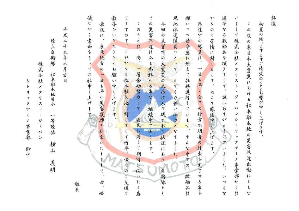 陸上自衛隊松本駐屯地司令部からの感謝状
