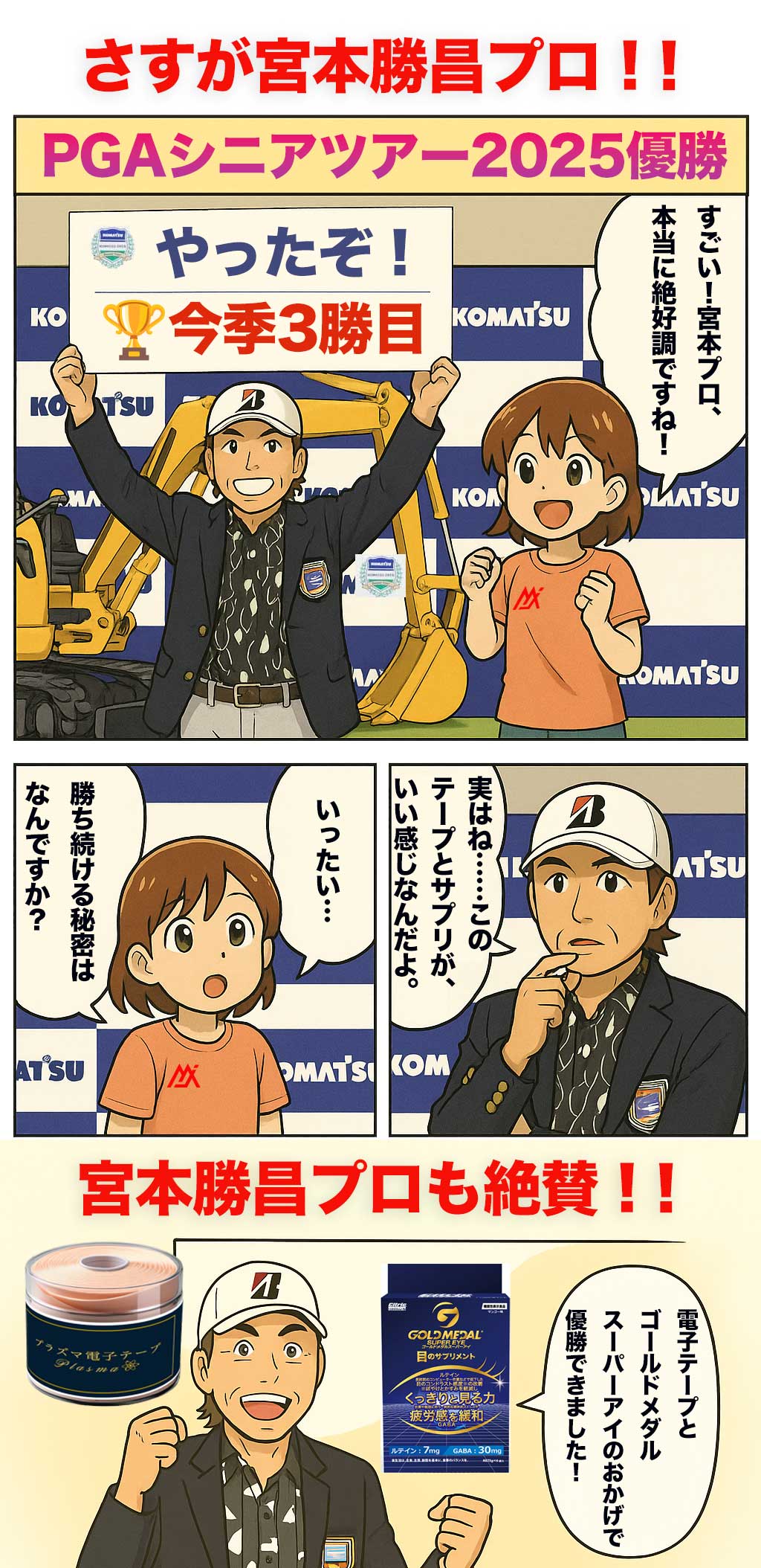 弊社社長の森川は、小学生の頃から「人が生き返るような発明をしたい」なんて夢見てきましたが、宮本プロのこの姿はまさにそれです。プラズマ電子テープが身体の微細なエネルギーを活性化し、ゴールドメダル・スーパーアイのルテインとGABAが目を守りながら集中力を高めます。実績はPGAシニアツアーの3勝! 丸山茂樹プロをはじめ、著名アスリートからも推薦の声が上がっています。