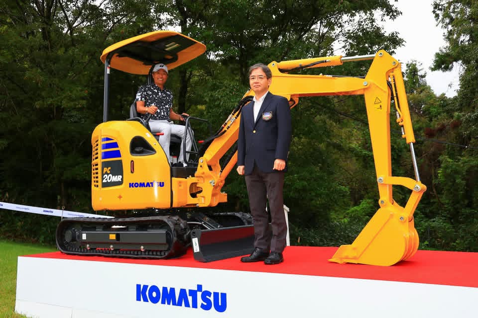 🚜 KOMATSU重機と記念撮影する宮本プロ 力強いパートナーシップ